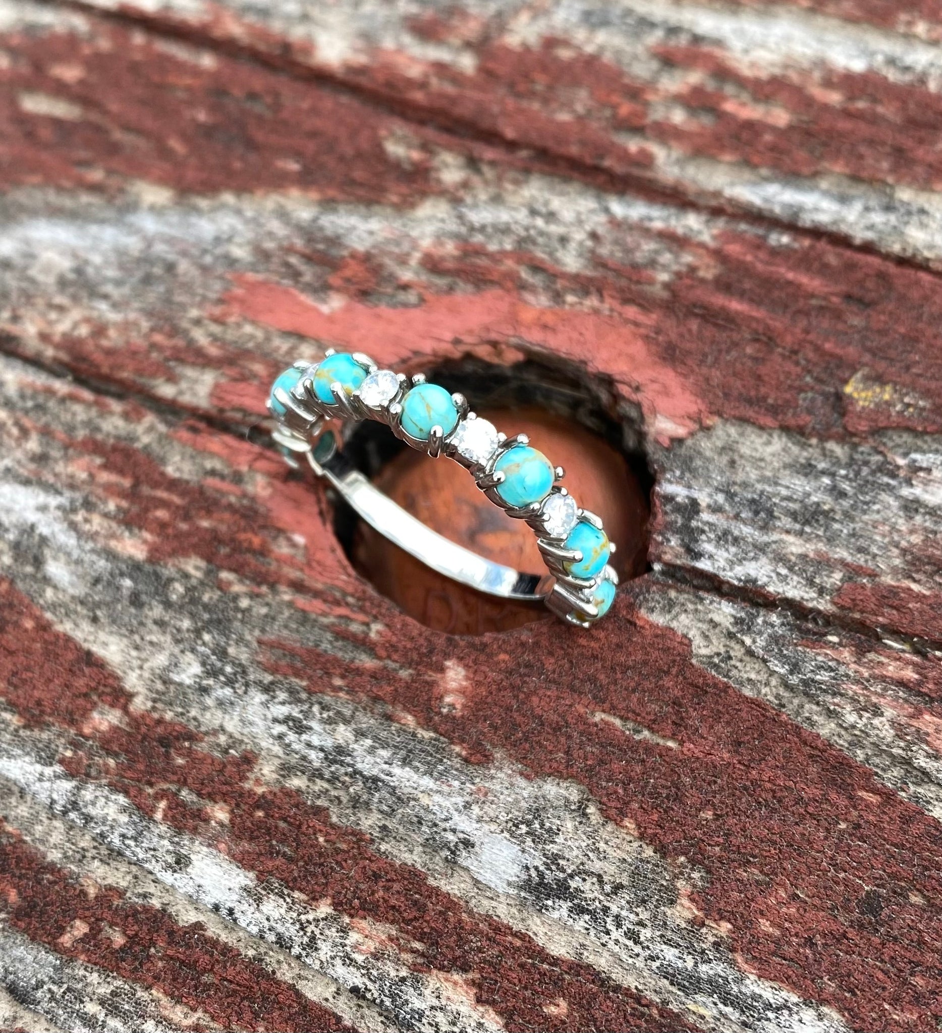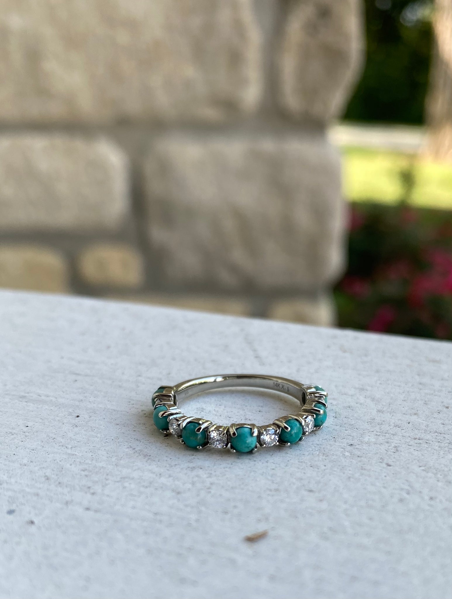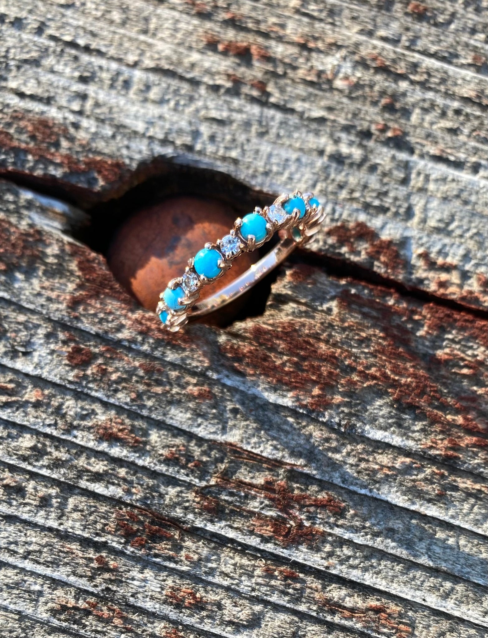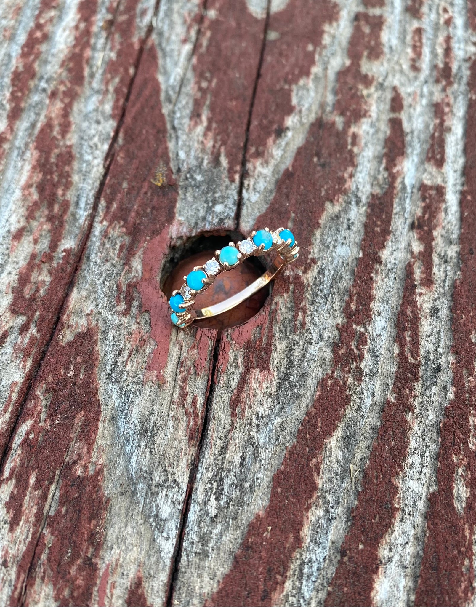 Listing is for a CUSTOM order, customize your way in your desired material and size! 14k gold prong style band with alternating sized turquoise and diamond stones (diamonds equivalate to about 1/3CTW). Please message me with any questions before placing the order. Custom items are non-refundable. Orders are final so please be sure of your selections before placing the order.